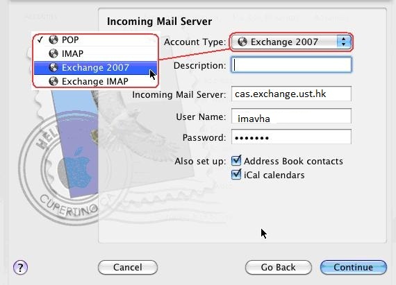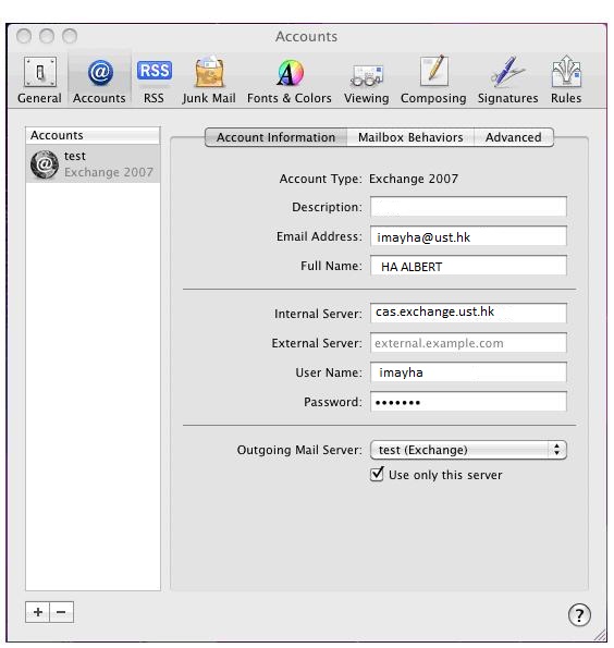Note: You do not need to enter anything in the field for External Server. Exchange account access: Unlike Outlook, using MacMail to connect to our Exchange servers requires three separate applications to handle Email, Contacts and Calendar. The three programs are the following. |