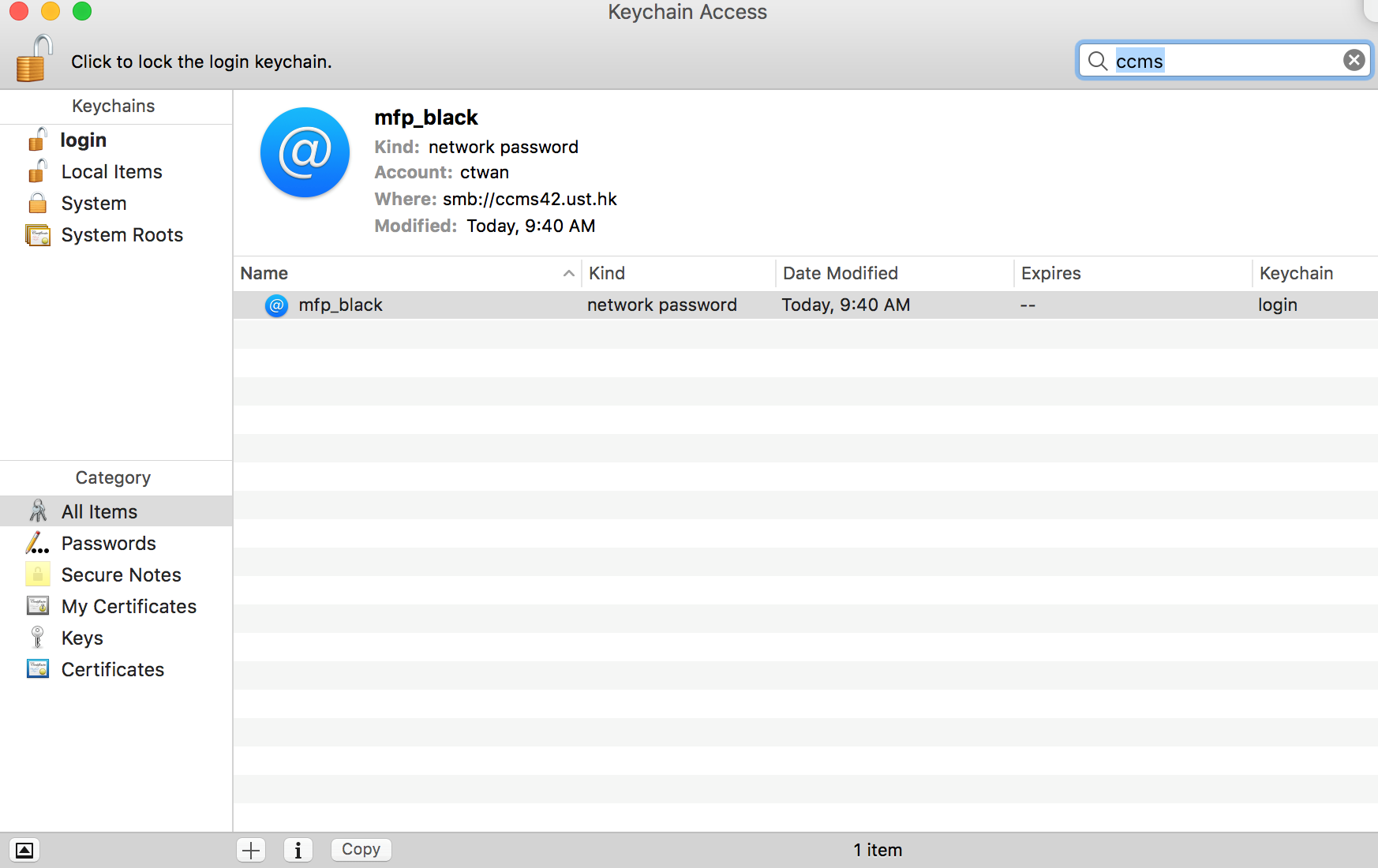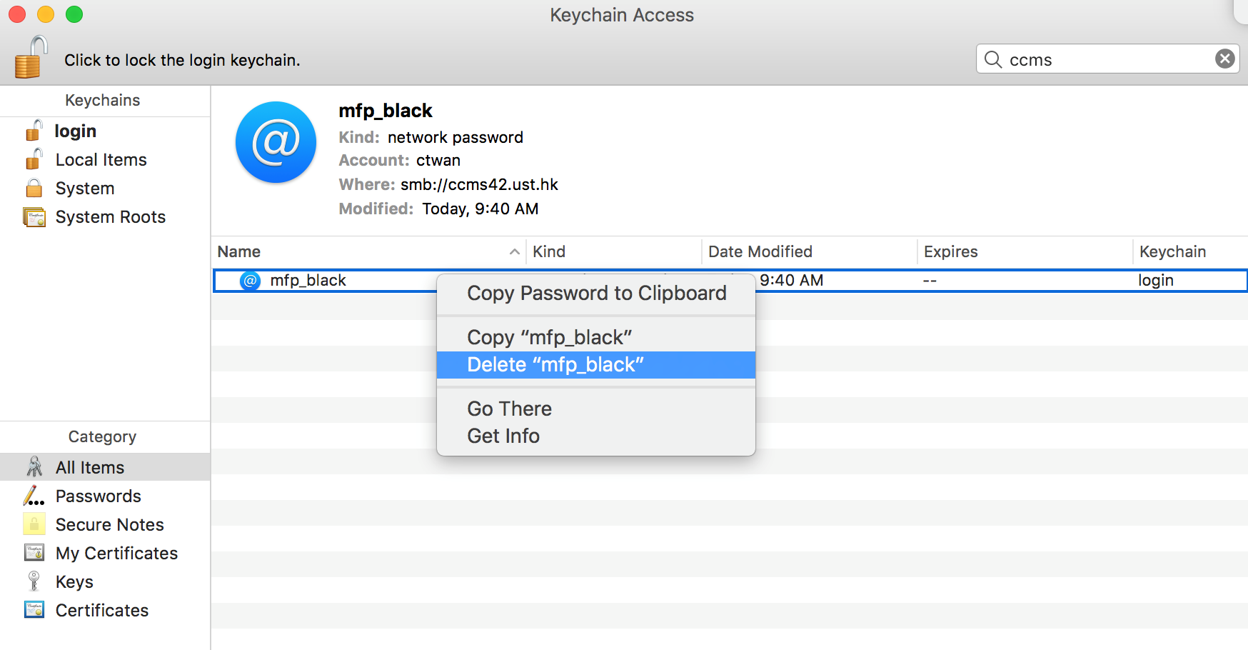3. From the search box in keychain access, search for “ccms” and remove all entries found